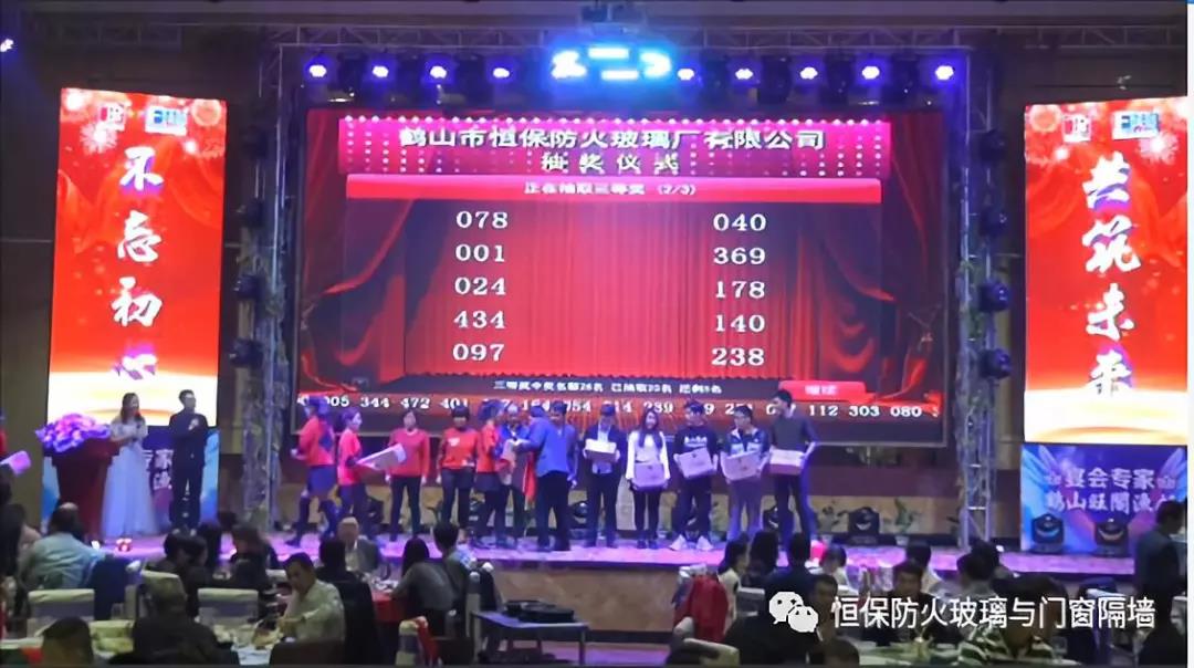 19:30分,恒保年會在鼓舞飛揚中拉開了帷幕,首先是恒保總經理陳沃林先生做年終致辭,陳總回顧了2018年所取得的成績與不足,并提出了2019年恒保要全力以赴,不忘初心,繼續奮斗,再創佳績的戰略方針。2018年是恒保跨越發展的一年。全體恒保家人,團結一心,艱苦奮斗,全力實現了公司既定的年度目標,同比各項重要指標增長逾80%。2018年我們大力引進新設備,開發新產品10多項,產品通過國家檢測20多項 ,至此,恒保出品已擁有37個3C認證,158份檢驗報告,成為行業內公認通過國家檢驗、認證最多的防火玻璃門窗企業;2018年在行業各類權威獎項評比中,榮獲“全國鋁門窗幕墻展 年度星品獎”、榮獲“新玻網 門窗玻璃十強企業”、陳沃林總經理榮獲鶴山市工商聯系統“工匠之星”稱號、陳沃林總經理榮獲第五屆中國玻璃行業“玻璃工匠”稱號、榮獲第三屆建筑門窗金軒獎“最具創新力配套產品”、榮獲第三屆建筑門窗金軒獎“最具發展潛力企業”、榮獲中國門窗幕墻行業“科技進步推動獎”等十多項獎項。2019年我們將持續優化各部門管理,提高員工工作技能、提高生產管理水平、提高生產效率、提高綜合管理能力,減少物料損耗,減少出錯率。加強精密型材、新型防火門窗的開發,滿足不同客戶的需求。2019年恒保上下一心、同心協力、不忘初心,共筑未來,為實現中國平安夢、世界平安夢繼續奮斗!