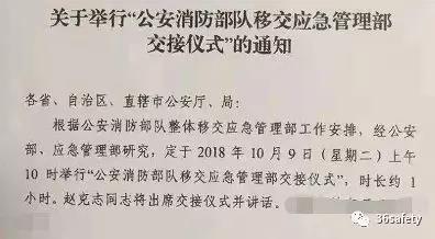 據(jù)多家媒體披露,根據(jù)公安消防部隊(duì)整體移交應(yīng)急管理部工作安排,經(jīng)應(yīng)急管理部、公安部部門研究,定于2018年10月9日(周二)上午10時(shí)舉行“公安消防部隊(duì)移交應(yīng)急管理部交接儀式”,時(shí)長(zhǎng)約1小時(shí),公安部部長(zhǎng)趙克志將出席交接儀式并講話,主會(huì)場(chǎng)設(shè)在公安部機(jī)關(guān)樓。