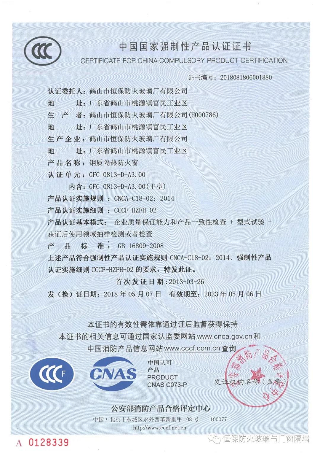 截止2018年10月,已獲得國(guó)家“CCCf”主型產(chǎn)品認(rèn)證證書36張,評(píng)定中心網(wǎng)上公告報(bào)告55份,四川中心公告26份,天津中心公告2份,英標(biāo)、歐標(biāo)、澳標(biāo)、美標(biāo)檢驗(yàn)報(bào)告35份評(píng)估報(bào)告20份,耐火窗等其他性能測(cè)試報(bào)告16份,恒保公司共獲報(bào)告154份涵蓋0.5小時(shí)至4小時(shí)防火系列產(chǎn)品,并擁有防火玻璃與門窗類專利21項(xiàng)。